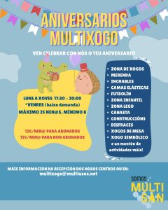 La actividad para el público infantil «Tardes Multixogo» incorpora de nuevo la posibilidad de celebrar cumpleaños en su espacio de juego.